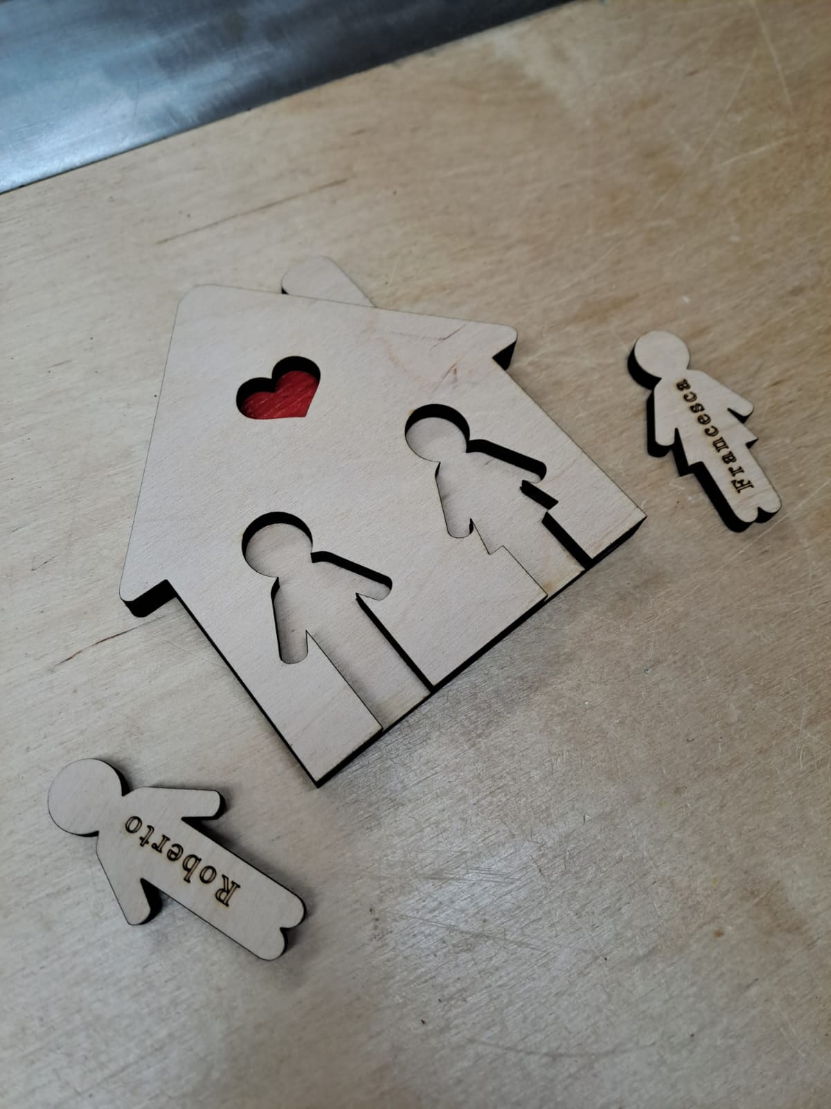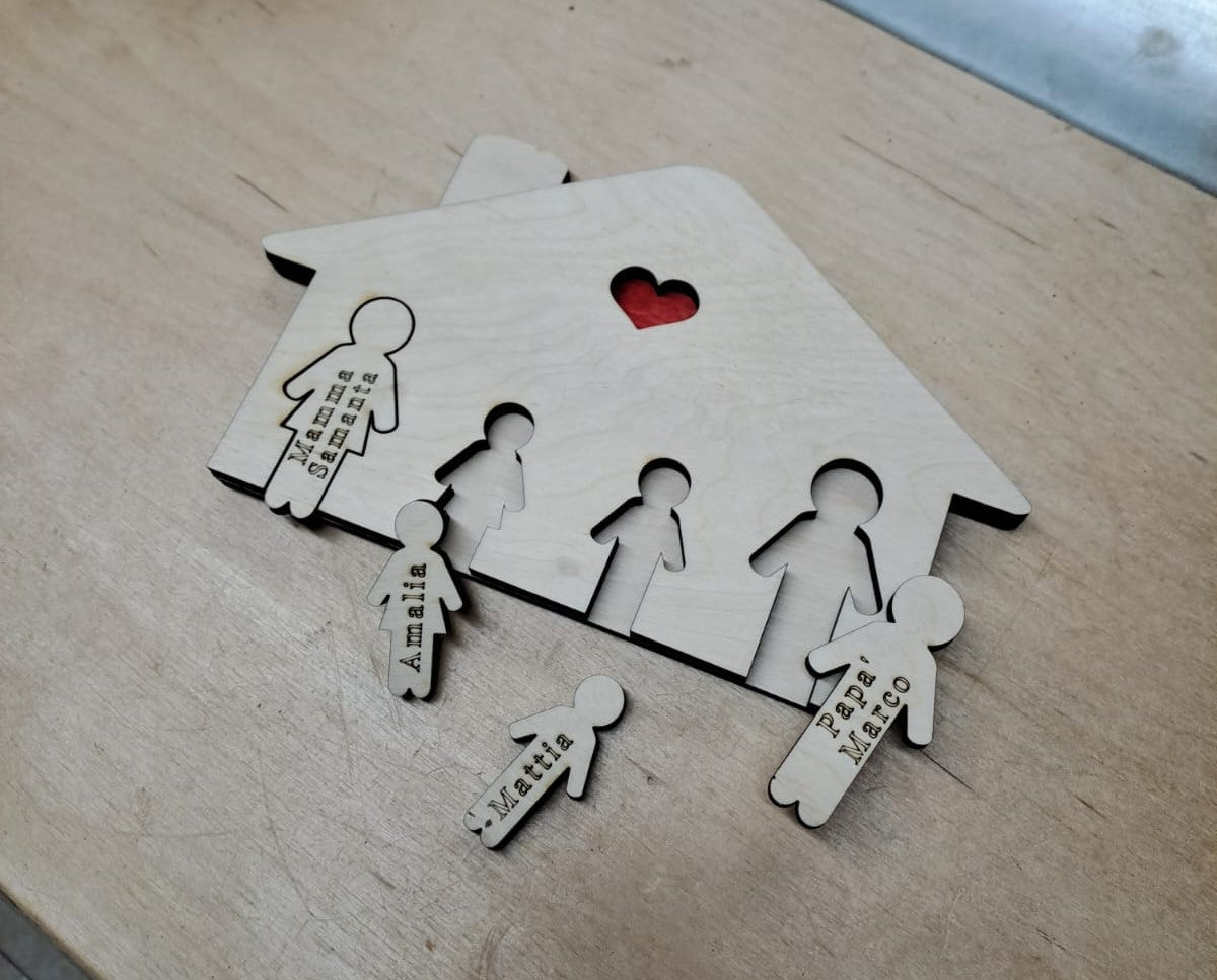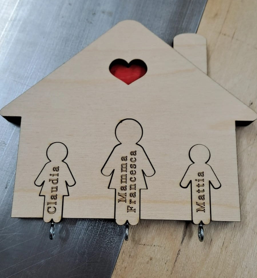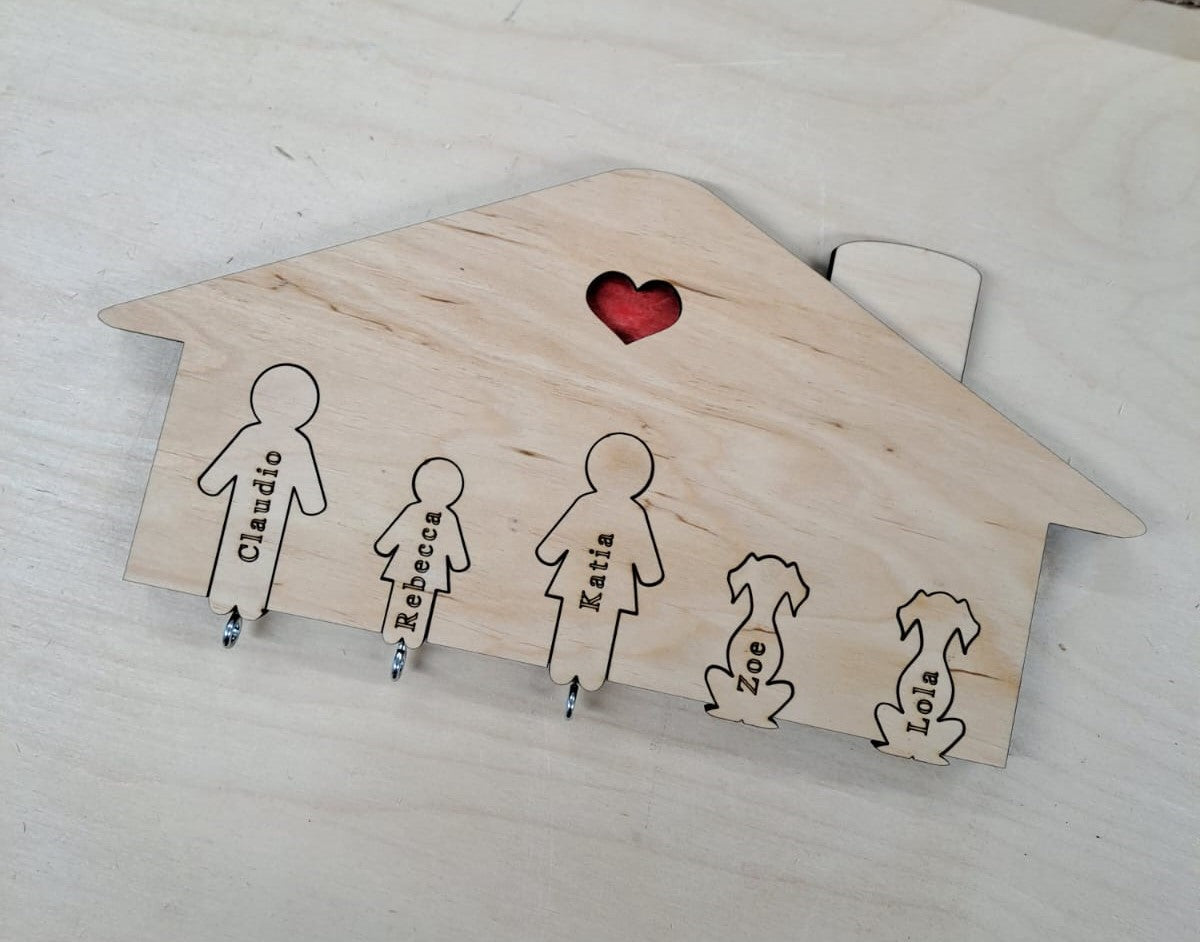Casetta porta chiavi, con forme della famiglia e animali domestici ( cane, gatto).