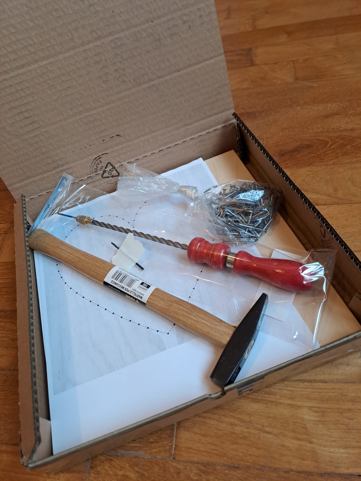 Nel kit troverete : martello, chiodi, trapano, 5 disegni punteggiati, 1 tavoletta levigata.