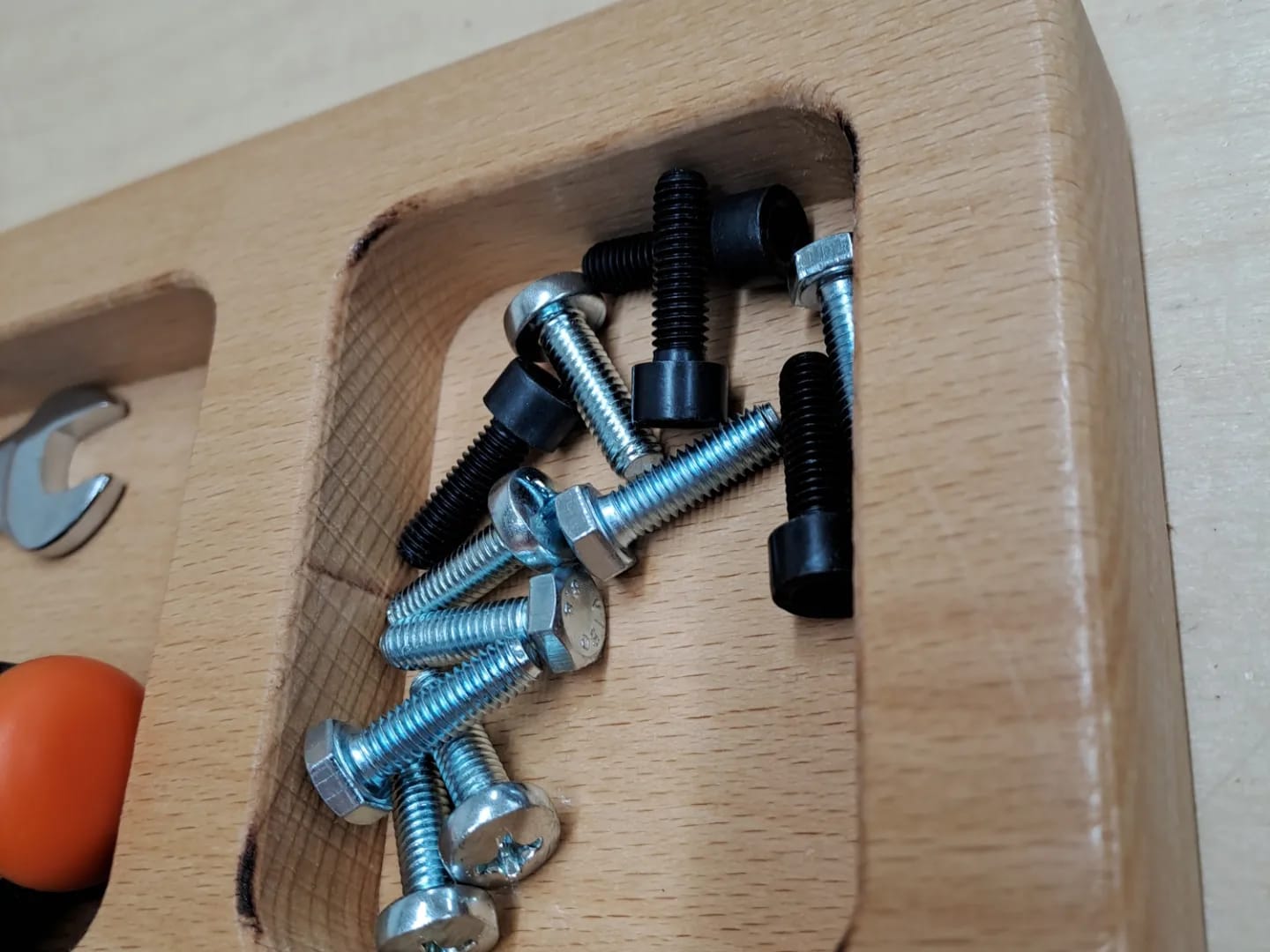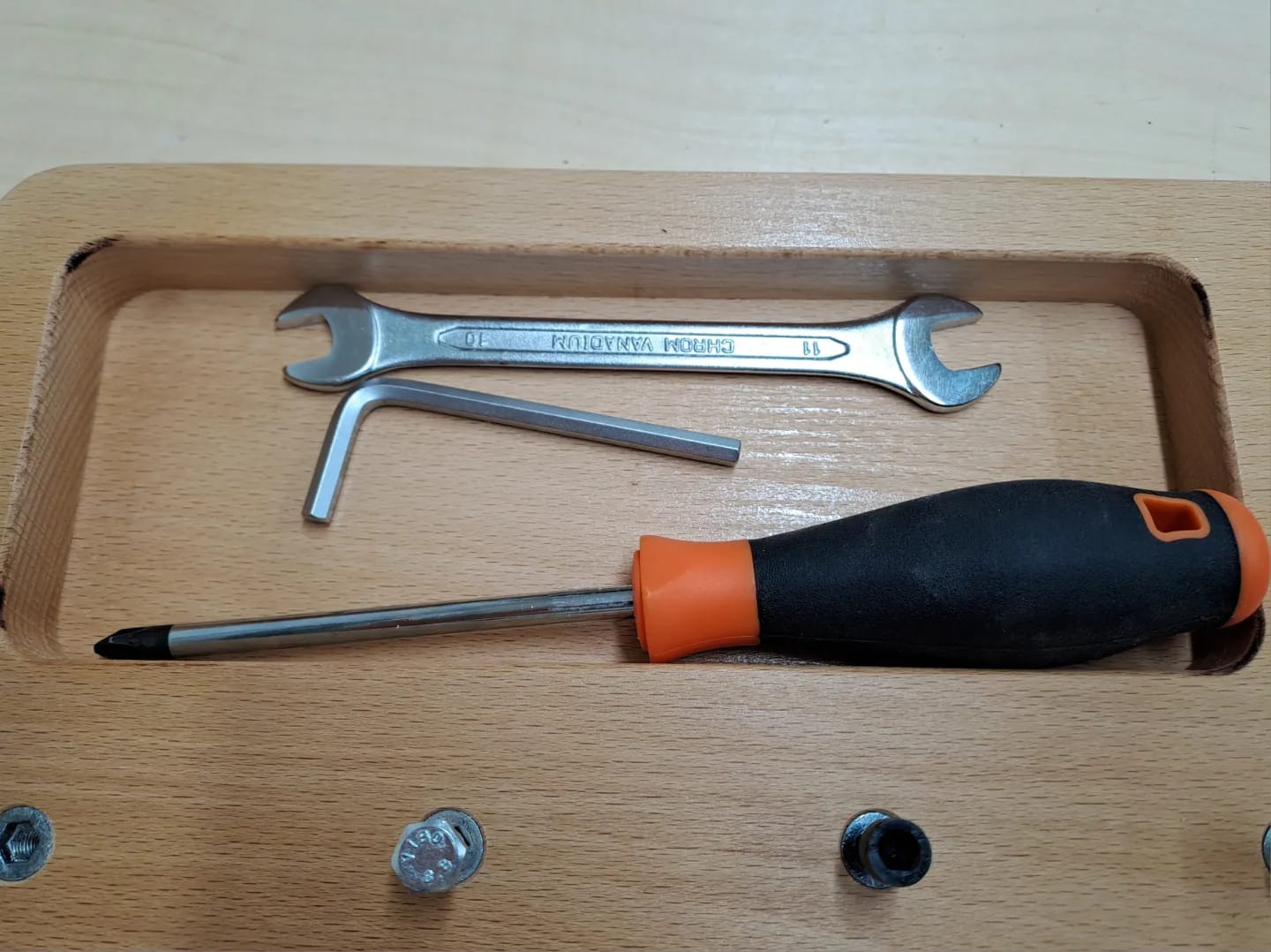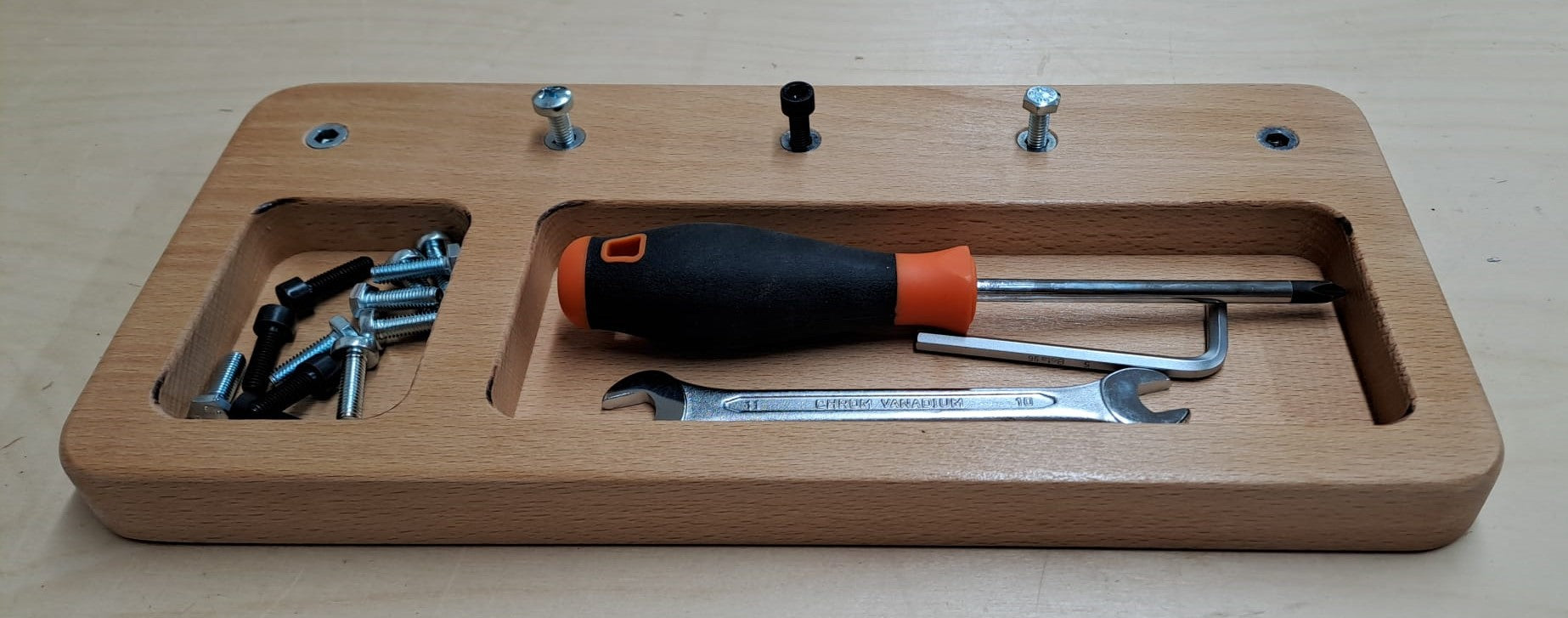 Faggio massello certificato FSC PEFC, viti, chiave inglese, cacciavite, chiave a brugola.