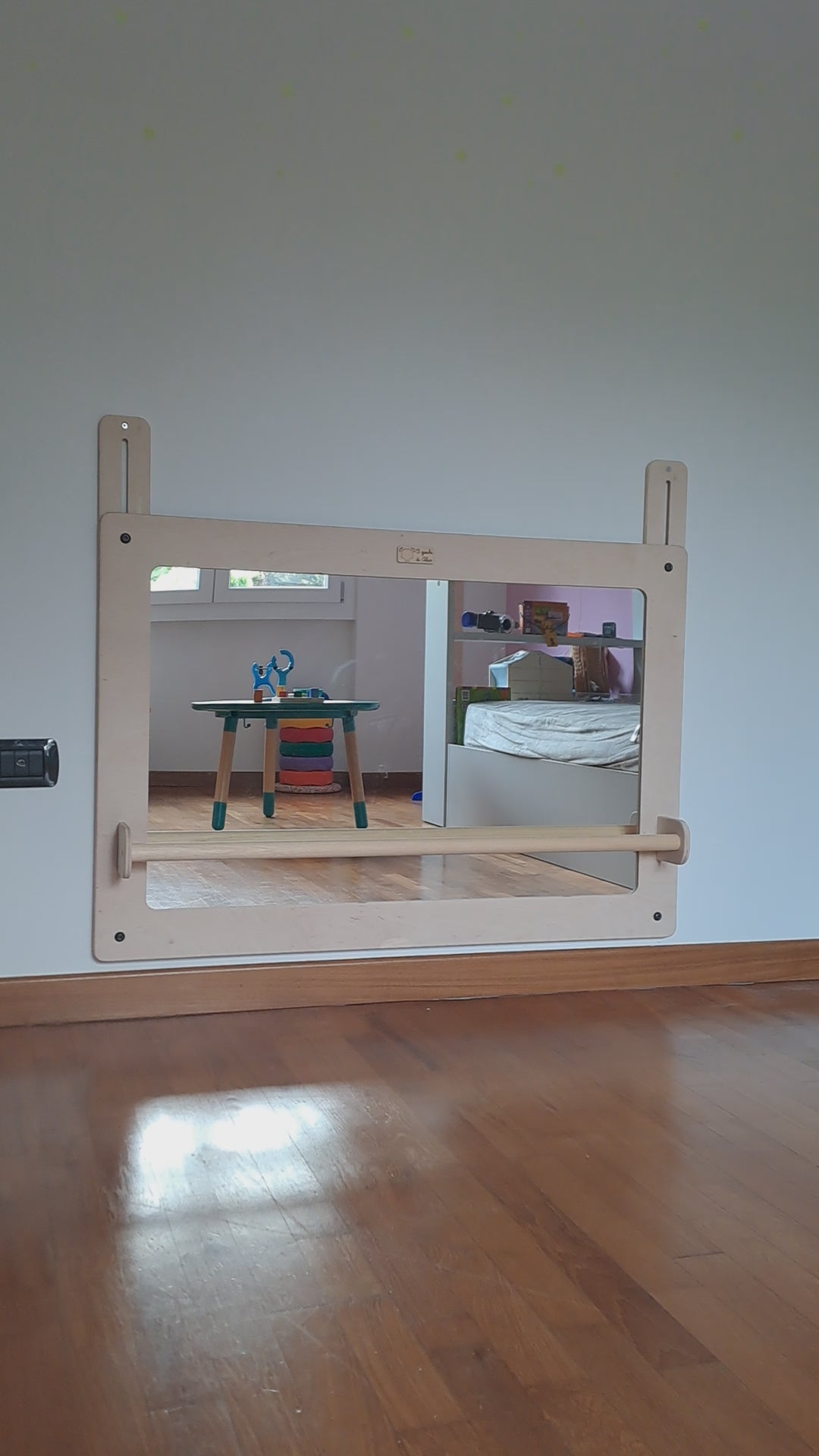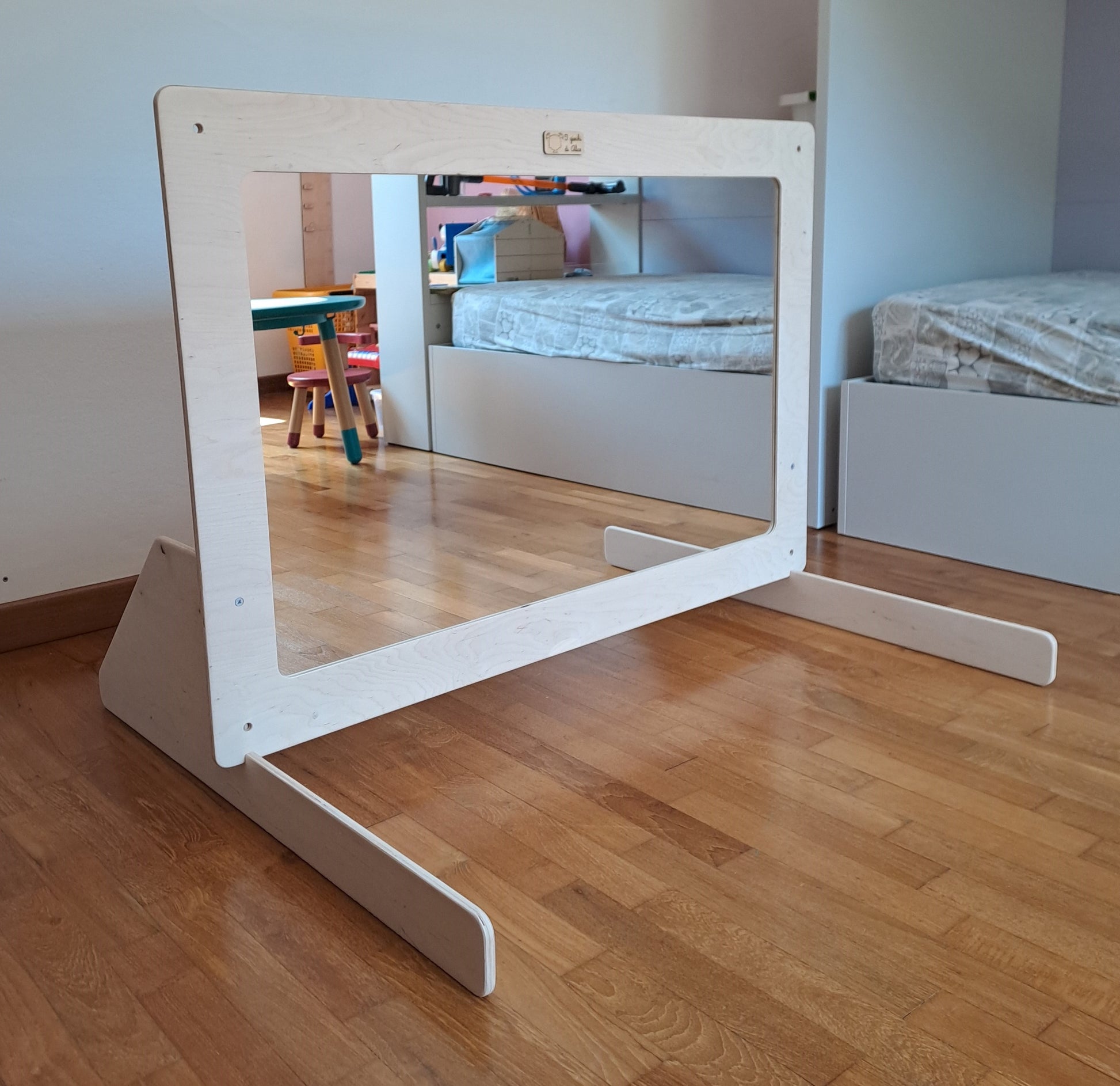 Per i primi mesi si useranno gli accessori per tenere lo specchio a terra ( già compresi), per essere posizionato dove si vuole, all'altezza del pavimento. Autoportante, in modo assolutamente sicuro.