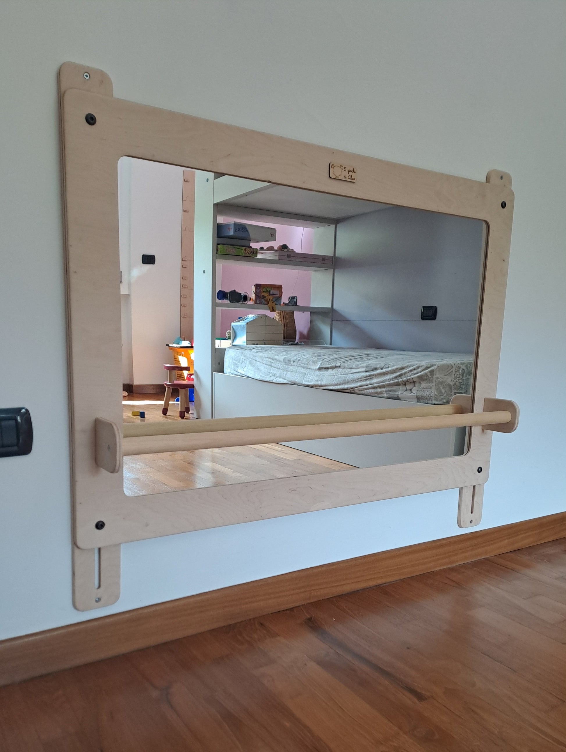 Man mano che crescerà, verrà fissato al muro tramite altri accessori, che permetteranno di alzare lo specchio, senza nuove forature o staccare lo specchio dal muro. Dotato anche di una comoda sbarra per l'appoggio.